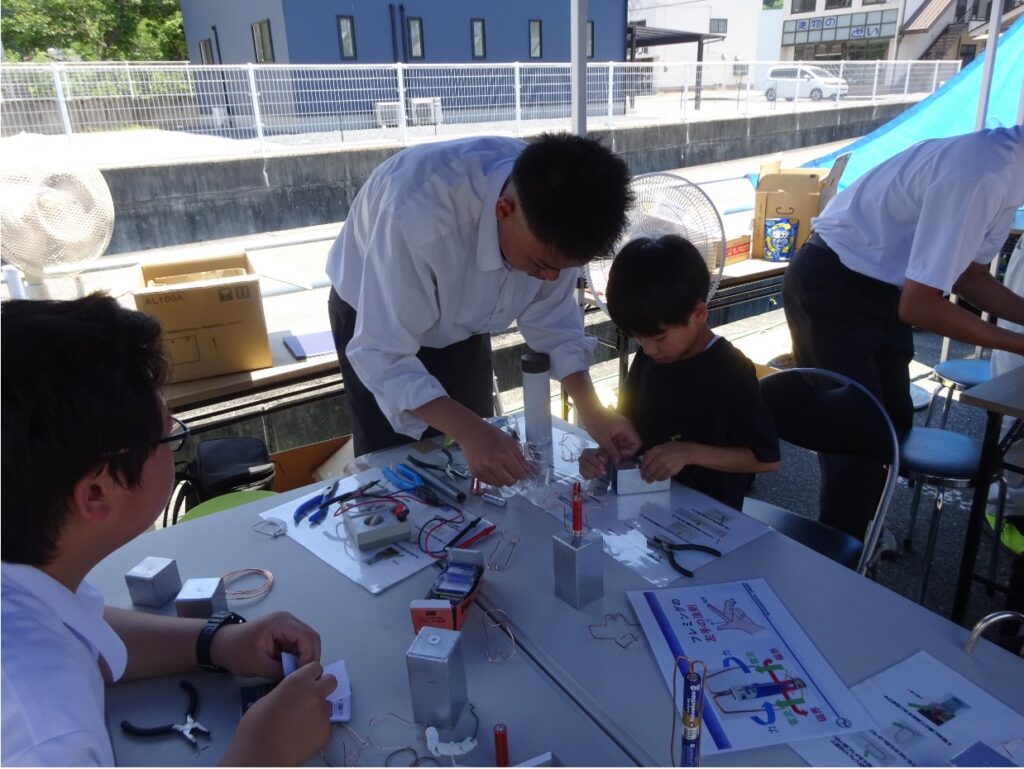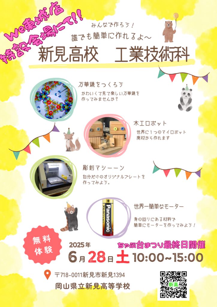 6月28日(土)に庄原市東城町にある書店の「ウィー東城店」にて工業技術科が体験実習を行ってきました。 この日は出版社と書店がコラボして「ちゃぶ台まつり2025」という、20店舗の出店で販売や体験ができるお祭りイベントがあり、 工業技術科も体験型のブースを出店してきました。