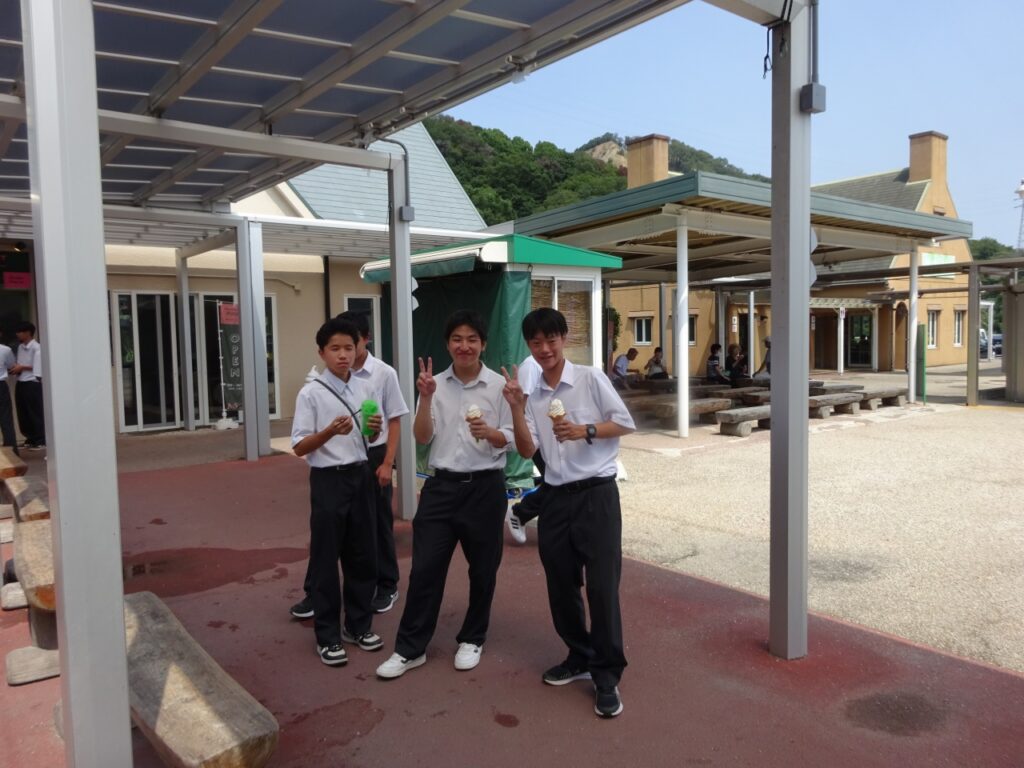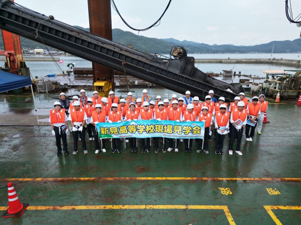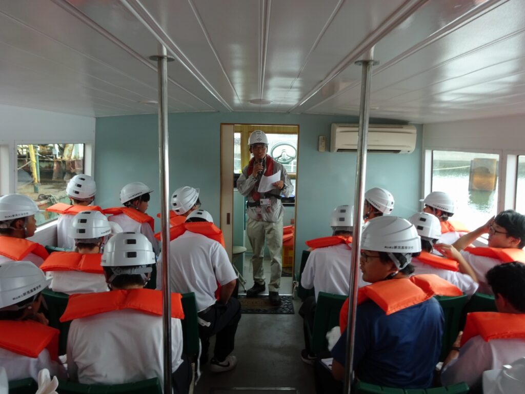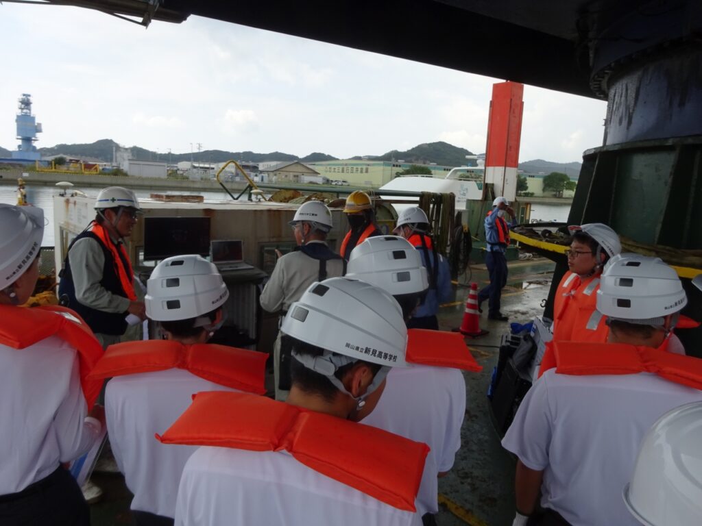 工業技術科1年次生が校外学習に行ってきました。午前中はタチバナ工業株式会社様の水島港付帯施設工事現場を見学させて頂きました。陸の土木工事現場は普段でも目にすることはありますが、海の土木工事現場の見学は初めてでした。陸とは違って基本目視出来ない海中作業ということで、3Dソナーやバーチャルシステムを使って作業する様子を見学させて頂きました。今回は岸壁の拡張のために海中へ直径1.1メートル長さ18メートルの巨大な鋼管杭の打設をしていたのですが、この巨大な杭を10㎝以内の誤差に抑えて打設をする技術に圧倒されました。