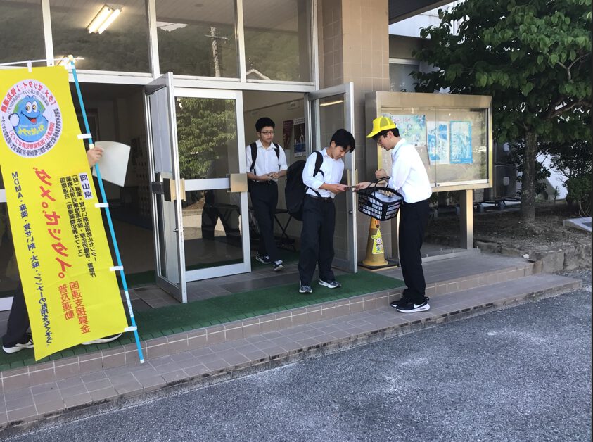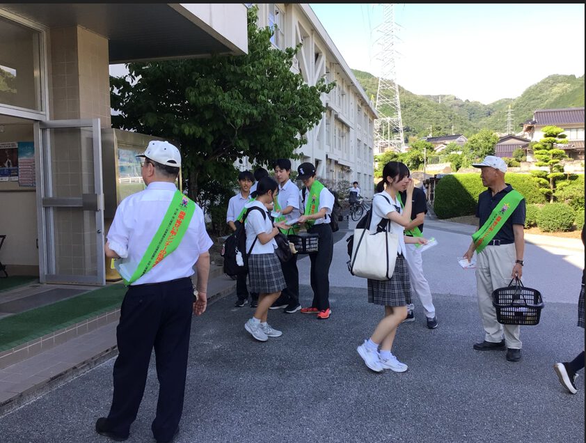 薬物乱用防止キャンペーンを実施しました! 2025/07/10 最終更新日時 : 2025/09/24 niimihs 6月26日(木)は「国際麻薬乱用撲滅デー」でした。学校薬剤師 西井先生・備北保健所・地域の愛育委員さんなどに協力していただき薬物乱用防止ウェットティッシュ・蛍光ペン・チラシなどを配布し、啓発活動を行いました。 ボランティアで一緒に配布してくれた生徒たち!!